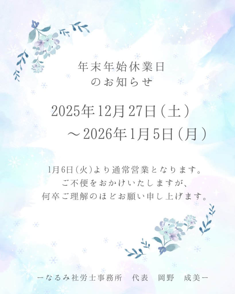年末年始休業のお知らせ お知らせ 2025.12.04 平素は格別のお引き立てを賜り、厚く御礼申し上げます。 なるみ社労士事務所では、本年の業務を2025年12月26日(金)15時をもちまして終了する予定でございます。 新年は2026年1月6日(火)より通常通り営業させていただきます。 来年も変わらぬお引き立てのほどよろしくお願い申し上げます。 【年末年始休業期間】2025年12月27日(土)から2026年1月5日(月)まで 休業期間中、大変ご不便をおかけいたしますが、どうかご了承のほどお願い申し上げます。 なるみ社労士事務所 代表 岡野成美